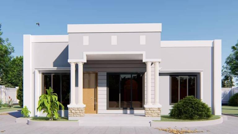 Beautiful small three-bedrooms house. Very suitable for a bit small budget construction. It has one master bedroom that has a dressing space and a toilet; it also has two single bedrooms, a large and comfortable public toilet, a kitchen, a store, a dining and a large and beautiful living room. It requires a plot of at least 20×20 meters.
